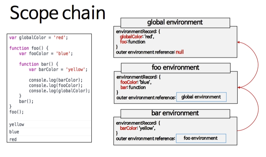 javascript의 스코프는 함수가 생성될 때의 [[Scope]] 프로퍼티로 참조하고 있는 변수 객체들과, 함수가 실행될 때의 변수 객체를 참조하고 있다. 따라서, 현재의 scope에 없는 변수 또한, scope chain을 통해 참조가 가능하다.