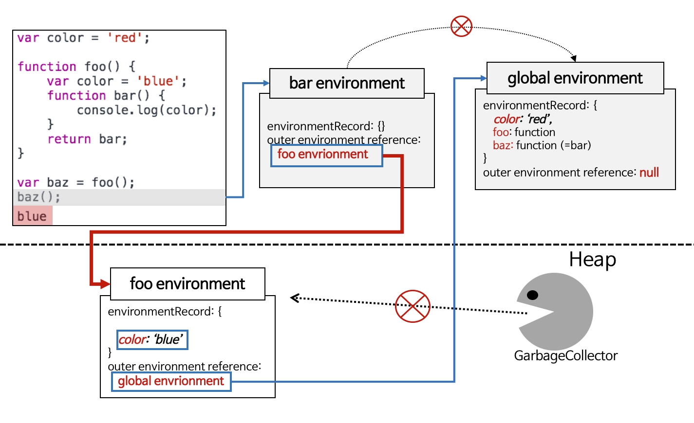 baz(); // blue // 4baz는 global에서 실행되었지만, color로 blue를 참조하였다. 이는 bar 함수의 렉시컬 환경이 outer environment로 foo environment를 참조하고 있었기 때문이다. 자바스크립트는 렉시컬 스코프이기 때문에 실행 컨텍스트와 관계 없이, bar environment는 foo environment를 outer lexical environment로 결정하게 된다. 따라서 global에서 baz를 호출하더라도 outer environment인 foo에서 color를 찾은 것이다. 이러한 bar와 같은 함수를 클로저라고 한다.