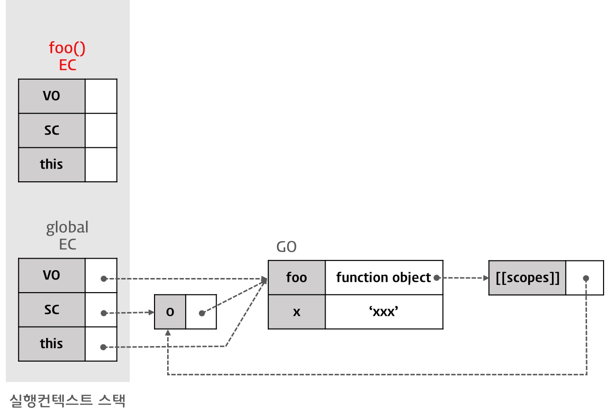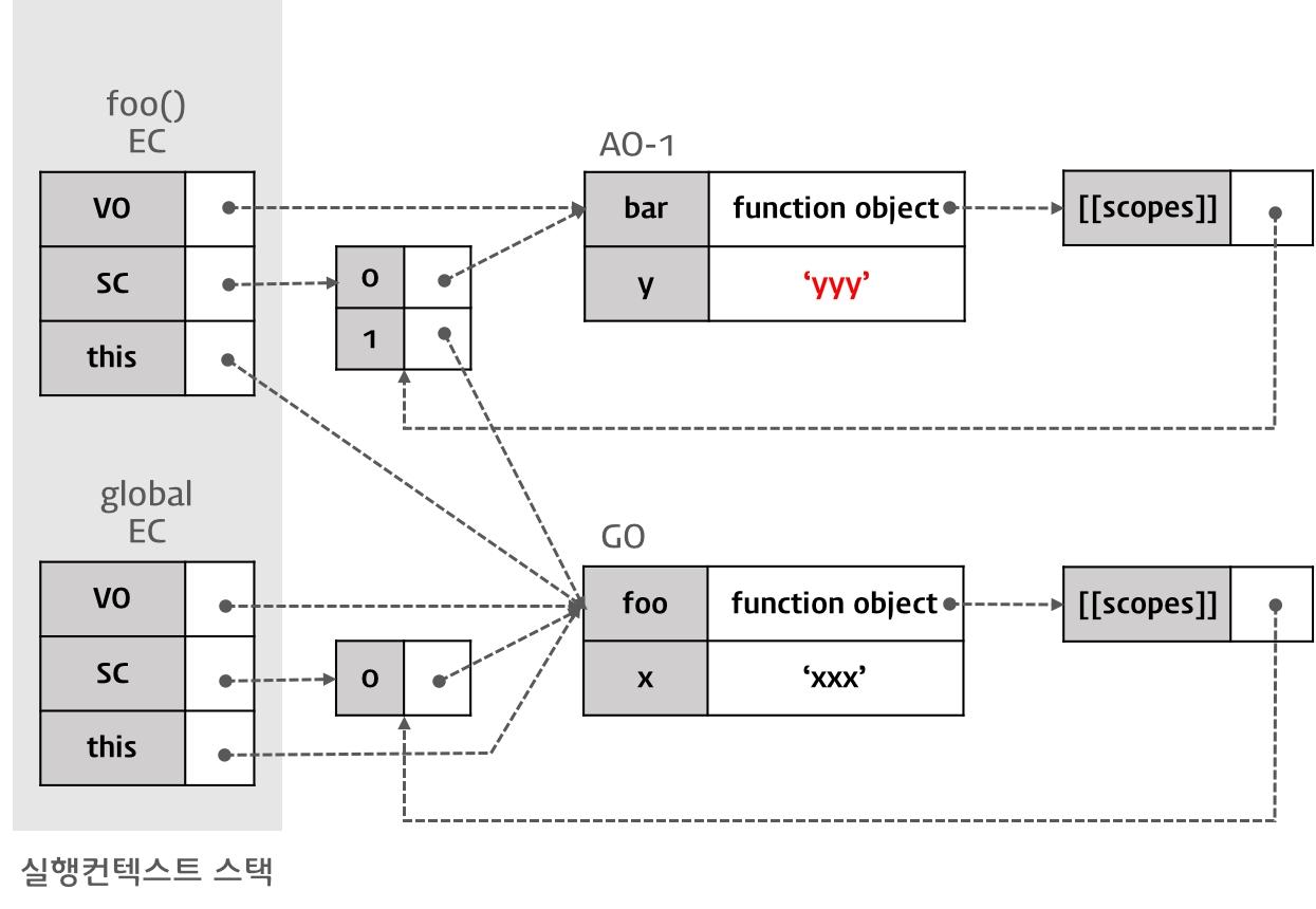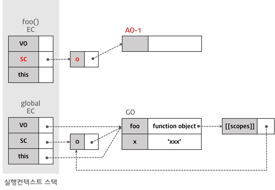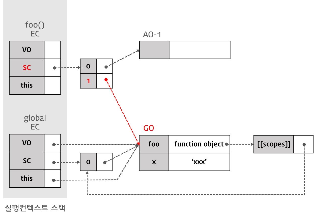 [[Scopes]]가 스코프 체인에 push된다. 즉, foo의 스코프 체인은 AO와 GO를 순차적으로 담은 리스트를 가리키게 된다.fooContext.Scope = fooContext.AO + foo.[[Scopes]]
