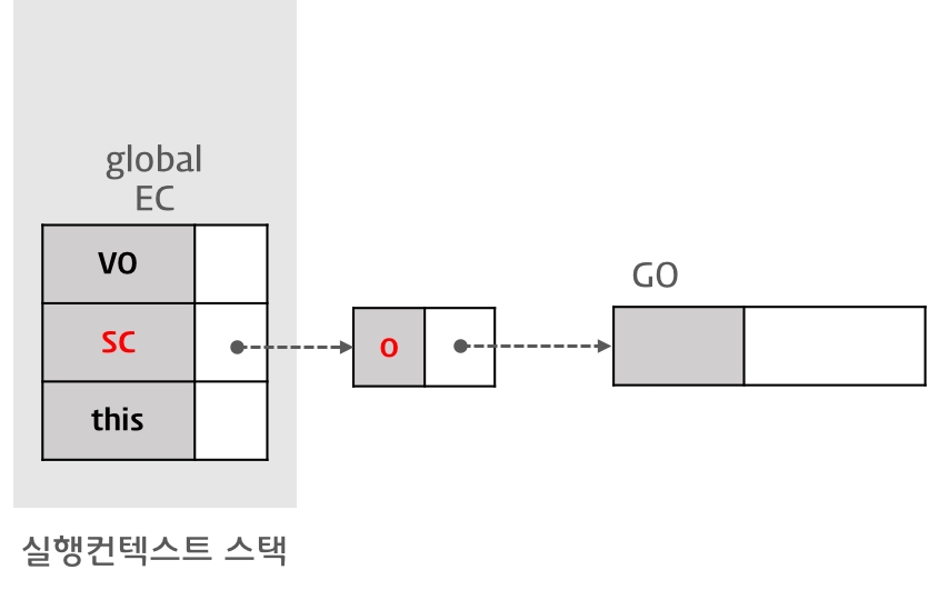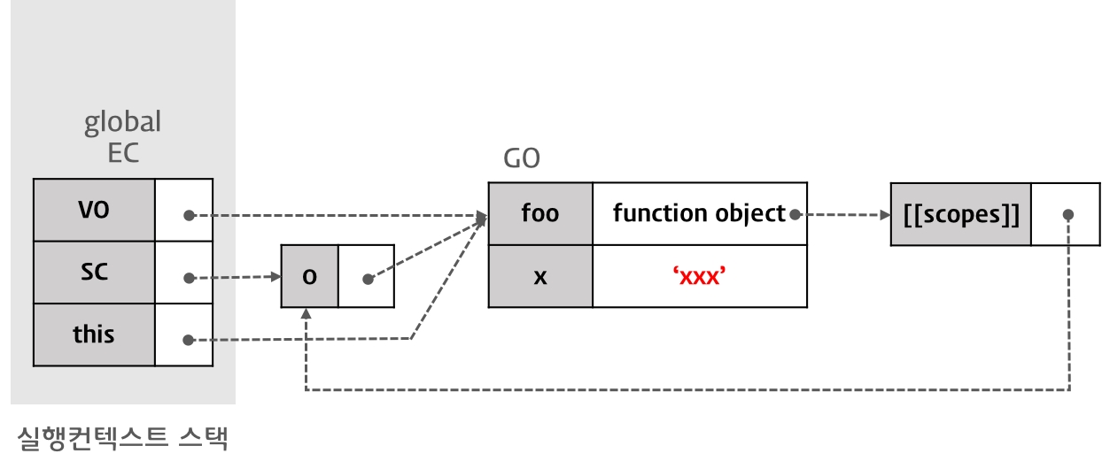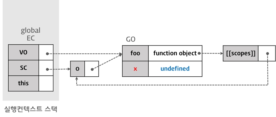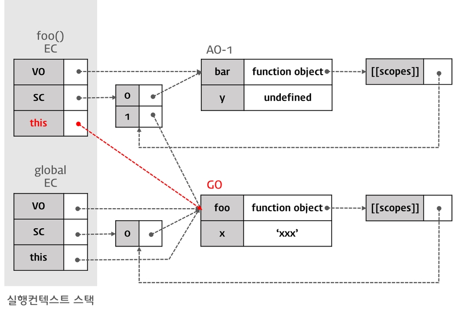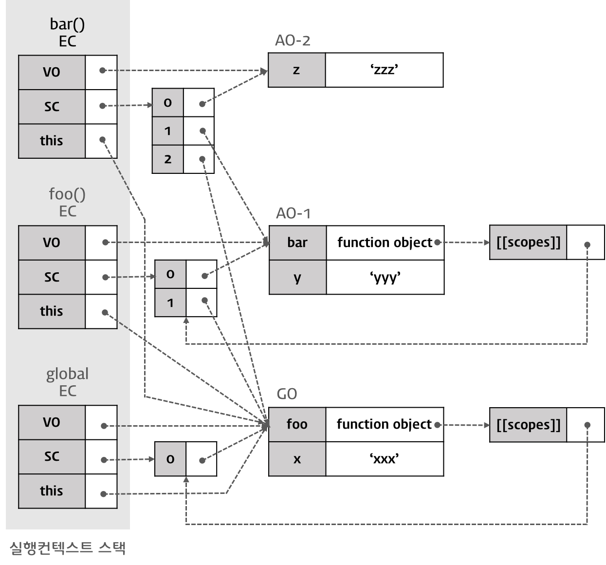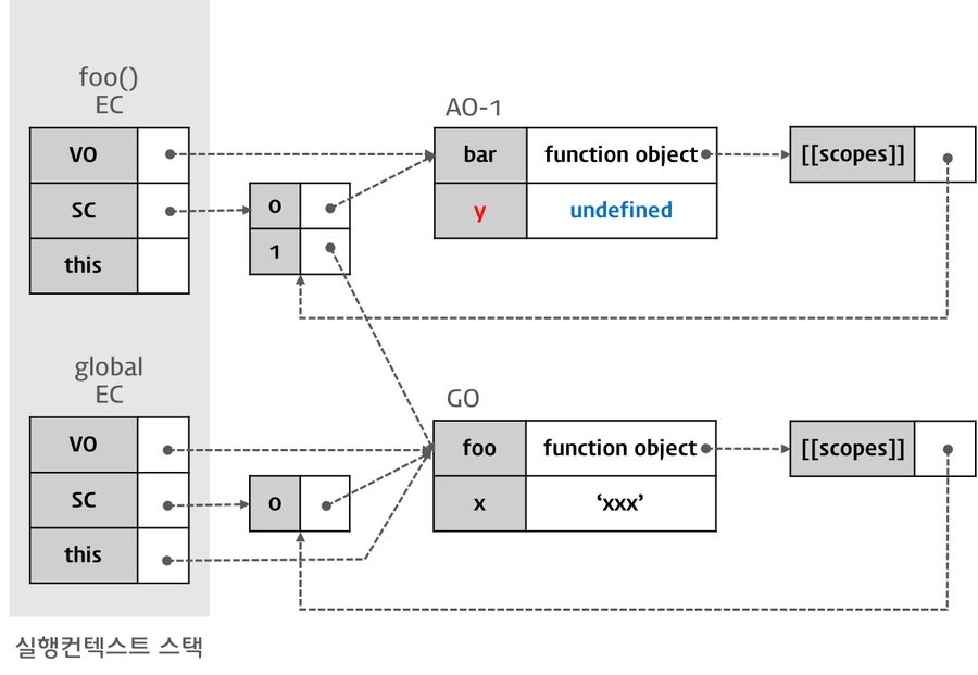[[Scopes]]가 스코프 체인에 push된다. 즉, foo의 스코프 체인은 AO와 GO를 순차적으로 담은 리스트를 가리키게 된다.fooContext.Scope = fooContext.AO + foo.[[Scopes]]
