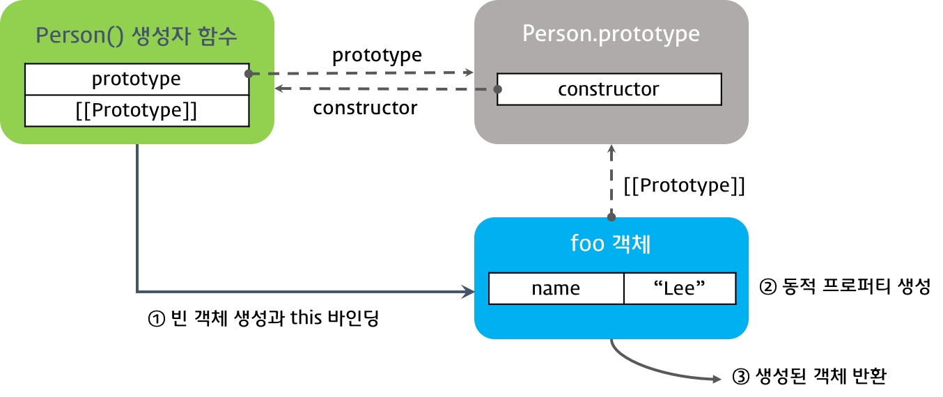 __proto__는 자신의 프로토타입 객체로 생성자 함수의 prototype object를 가리킨다. 이 객체는 생성자 함수의 prototype 프로퍼티가 가리키고 있다.