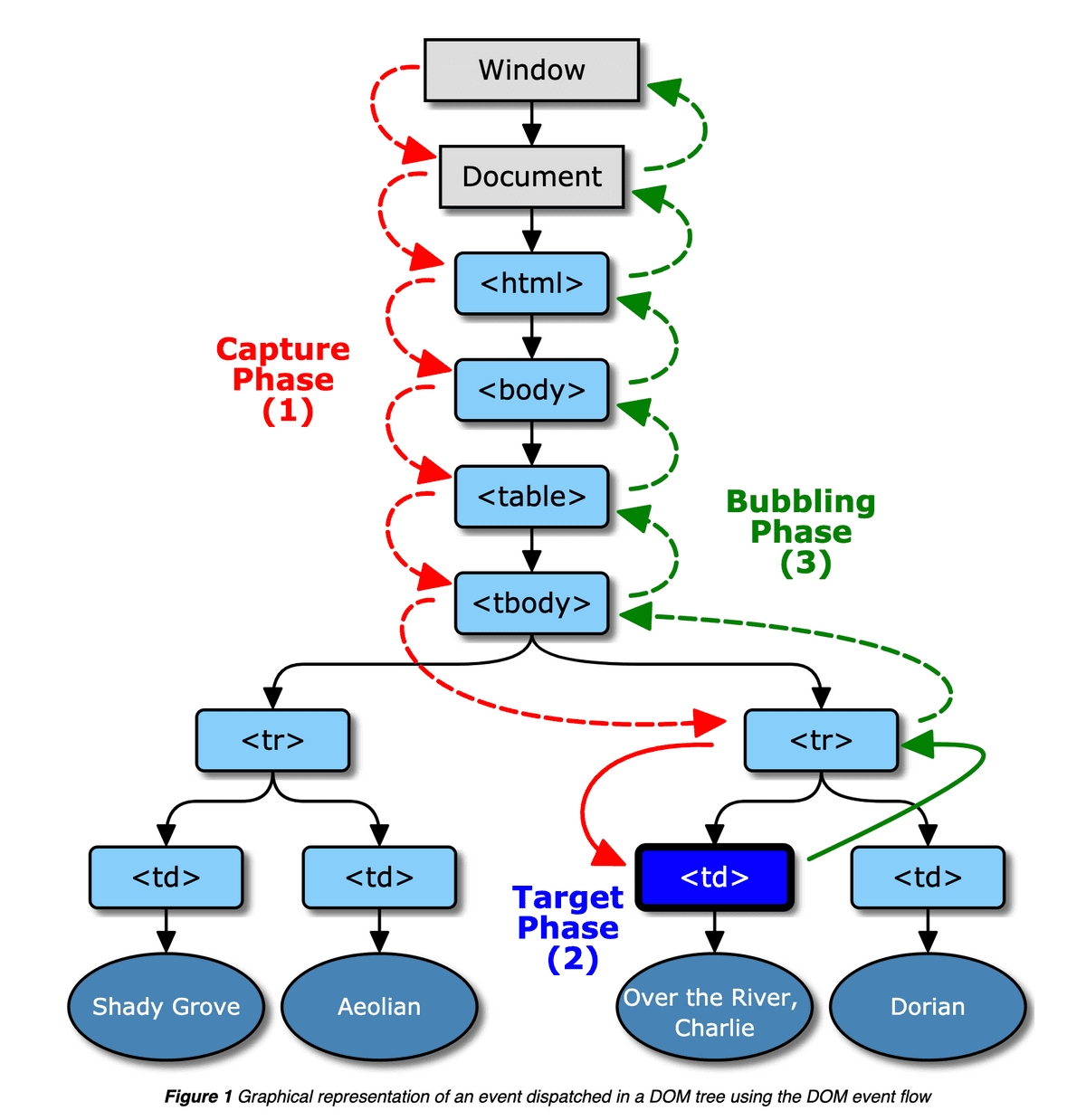 element2.addEventListener("click", doSomething, false);'click' 이벤트는 먼저 capturing phase에 들어간다. 이벤트는 이벤트 타겟에 도달할 때까지 capuring phase에 실행될, onclick event handler를 찾는다.